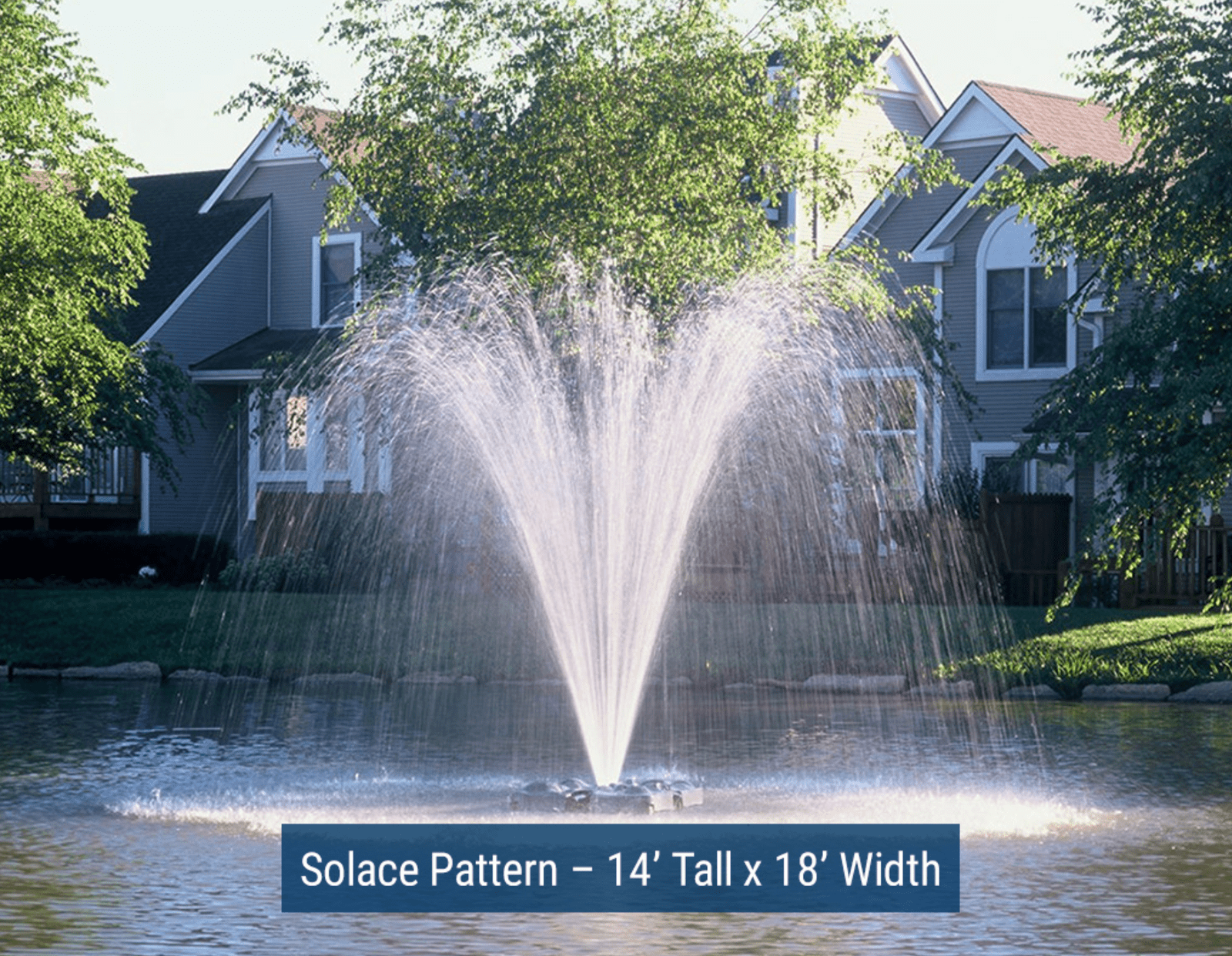 Horsepower determines the size of the spray pattern. Verify your pond depth and ensure spray won’t hit pond edges. Larger ponds allow for larger fountain displays, depending on shape and budget.